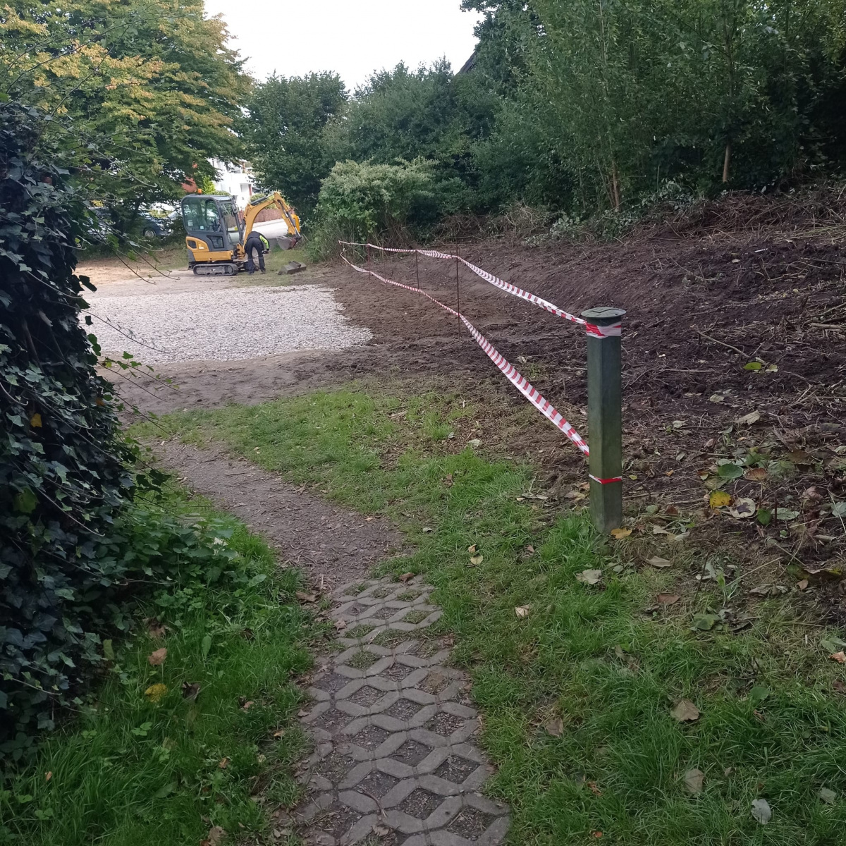 Die Gemeinschaftsarbeit auf der Wulfswiesenkoppel 2025 war eine der schweißtreibenden Arbeiten überhaupt. Dadurch das der Parkplatz in den letzten Jahren stark gelitten hat wurde hier eine neue Deckschicht aufgetragen. Der Wildwuchs zu den Kleingärten wurde entfernt und es wurde mit einem Bagger probiert den  japanischen Staudenknöterich aus zu graben. Auch hier Chapeau.