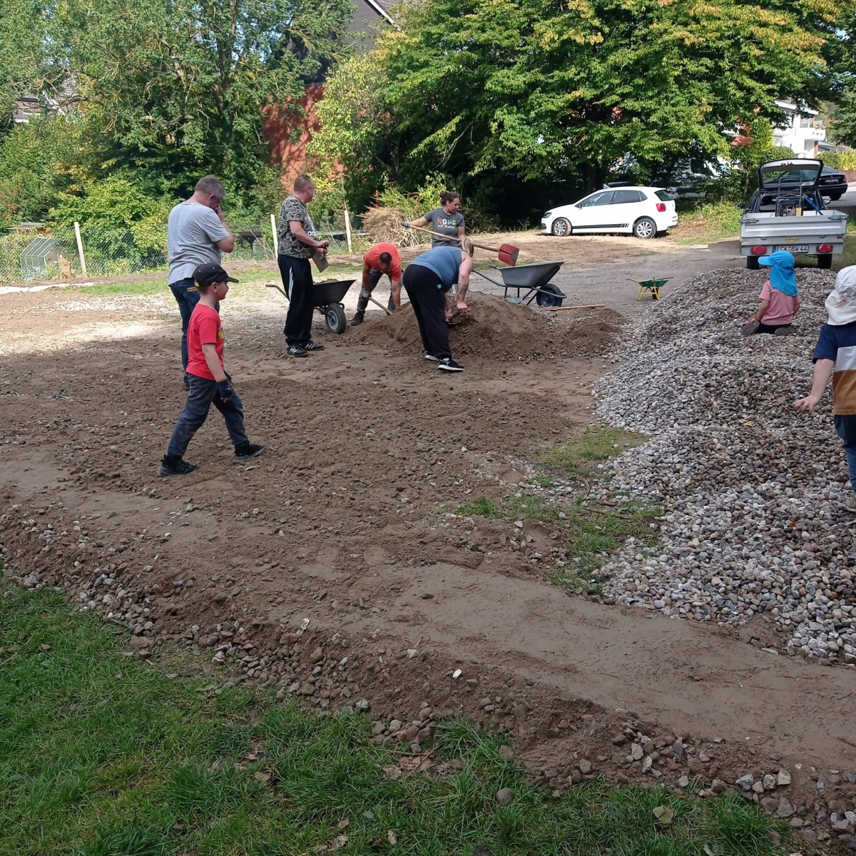 Die Gemeinschaftsarbeit auf der Wulfswiesenkoppel 2025 war eine der schweißtreibenden Arbeiten überhaupt. Dadurch das der Parkplatz in den letzten Jahren stark gelitten hat wurde hier eine neue Deckschicht aufgetragen. Der Wildwuchs zu den Kleingärten wurde entfernt und es wurde mit einem Bagger probiert den  japanischen Staudenknöterich aus zu graben. Auch hier Chapeau.