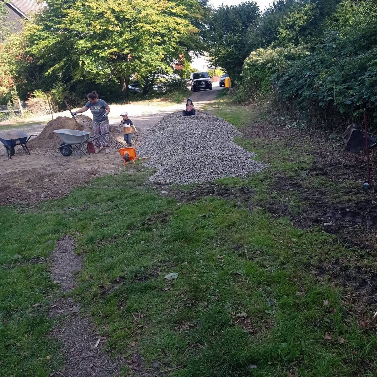 Die Gemeinschaftsarbeit auf der Wulfswiesenkoppel 2025 war eine der schweißtreibenden Arbeiten überhaupt. Dadurch das der Parkplatz in den letzten Jahren stark gelitten hat wurde hier eine neue Deckschicht aufgetragen. Der Wildwuchs zu den Kleingärten wurde entfernt und es wurde mit einem Bagger probiert den  japanischen Staudenknöterich aus zu graben. Auch hier Chapeau.