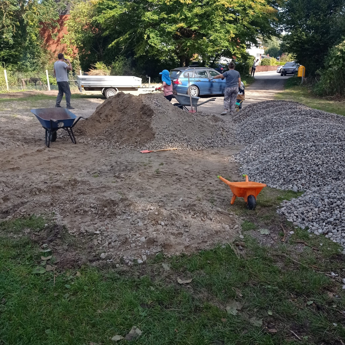 Die Gemeinschaftsarbeit auf der Wulfswiesenkoppel 2025 war eine der schweißtreibenden Arbeiten überhaupt. Dadurch das der Parkplatz in den letzten Jahren stark gelitten hat wurde hier eine neue Deckschicht aufgetragen. Der Wildwuchs zu den Kleingärten wurde entfernt und es wurde mit einem Bagger probiert den  japanischen Staudenknöterich aus zu graben. Auch hier Chapeau.