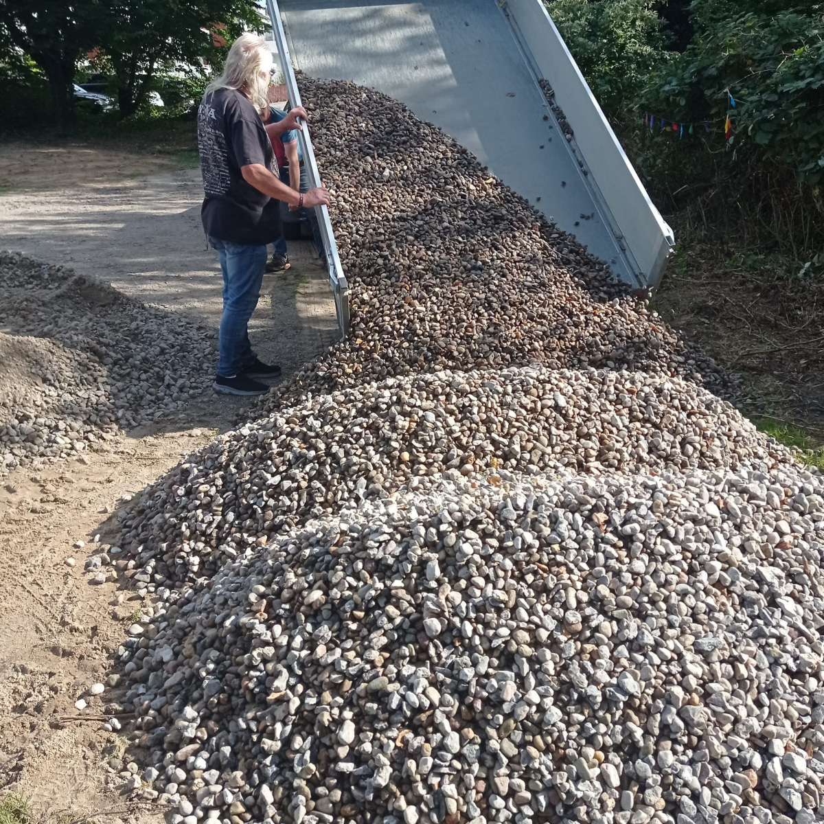 Die Gemeinschaftsarbeit auf der Wulfswiesenkoppel 2025 war eine der schweißtreibenden Arbeiten überhaupt. Dadurch das der Parkplatz in den letzten Jahren stark gelitten hat wurde hier eine neue Deckschicht aufgetragen. Der Wildwuchs zu den Kleingärten wurde entfernt und es wurde mit einem Bagger probiert den  japanischen Staudenknöterich aus zu graben. Auch hier Chapeau.