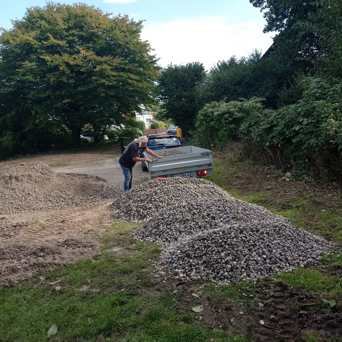 Die Gemeinschaftsarbeit auf der Wulfswiesenkoppel 2025 war eine der schweißtreibenden Arbeiten überhaupt. Dadurch das der Parkplatz in den letzten Jahren stark gelitten hat wurde hier eine neue Deckschicht aufgetragen. Der Wildwuchs zu den Kleingärten wurde entfernt und es wurde mit einem Bagger probiert den  japanischen Staudenknöterich aus zu graben. Auch hier Chapeau.