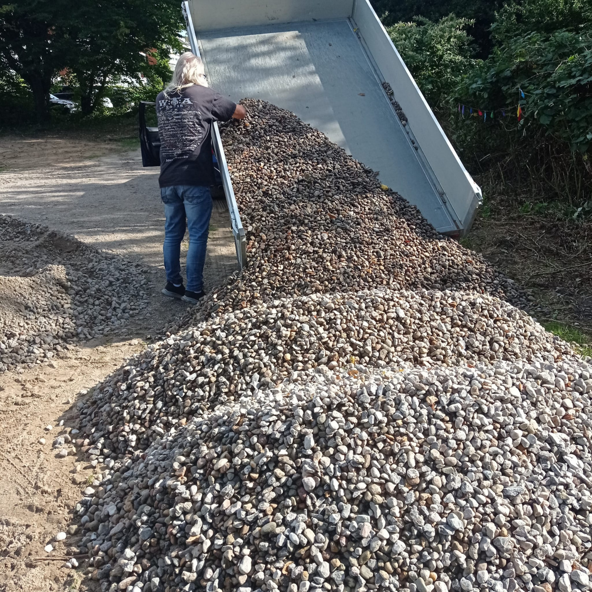 Die Gemeinschaftsarbeit auf der Wulfswiesenkoppel 2025 war eine der schweißtreibenden Arbeiten überhaupt. Dadurch das der Parkplatz in den letzten Jahren stark gelitten hat wurde hier eine neue Deckschicht aufgetragen. Der Wildwuchs zu den Kleingärten wurde entfernt und es wurde mit einem Bagger probiert den  japanischen Staudenknöterich aus zu graben. Auch hier Chapeau.